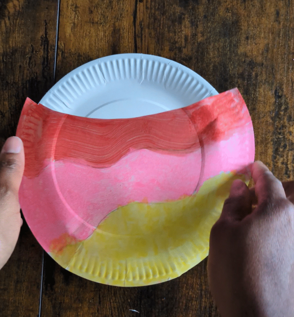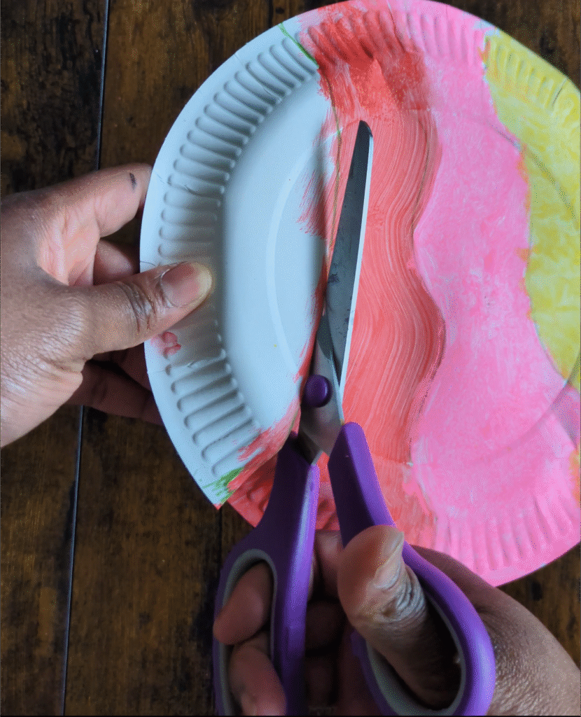 Cut one paper plate in half, as this half circle will be the “pocket.” Tip: Use scissors for this part. If you have shaky hands like me, consider outlining with a marker first for a clean cutout.