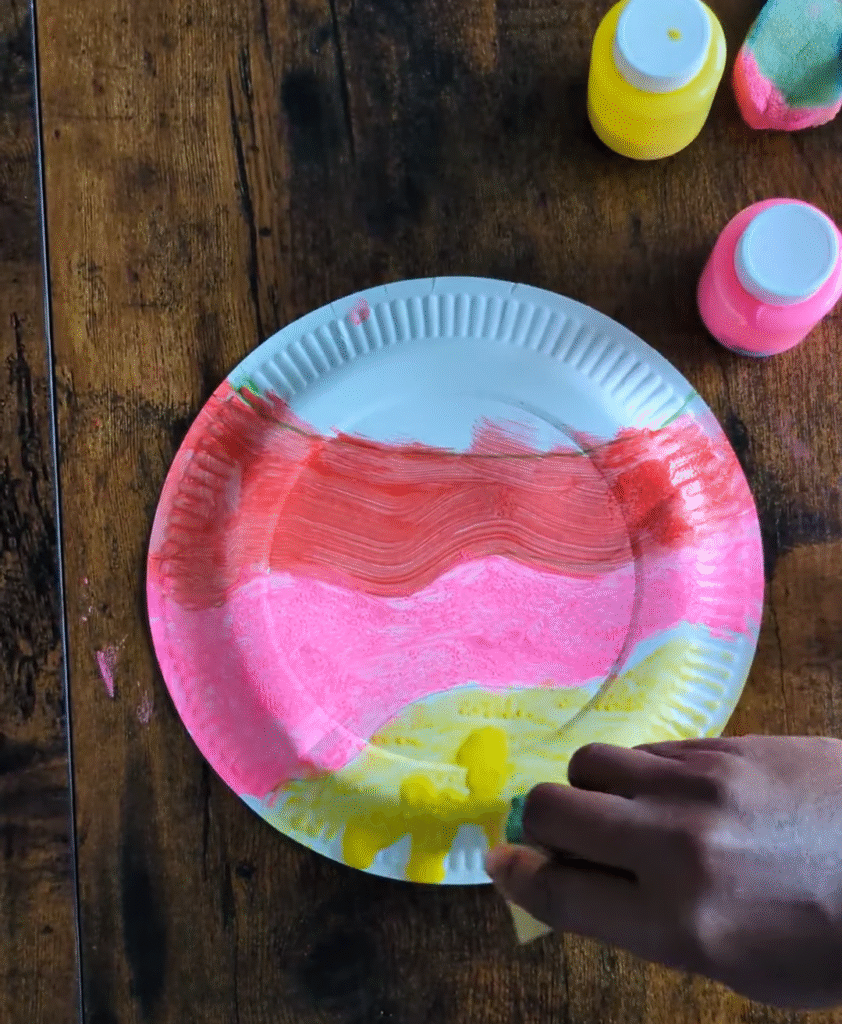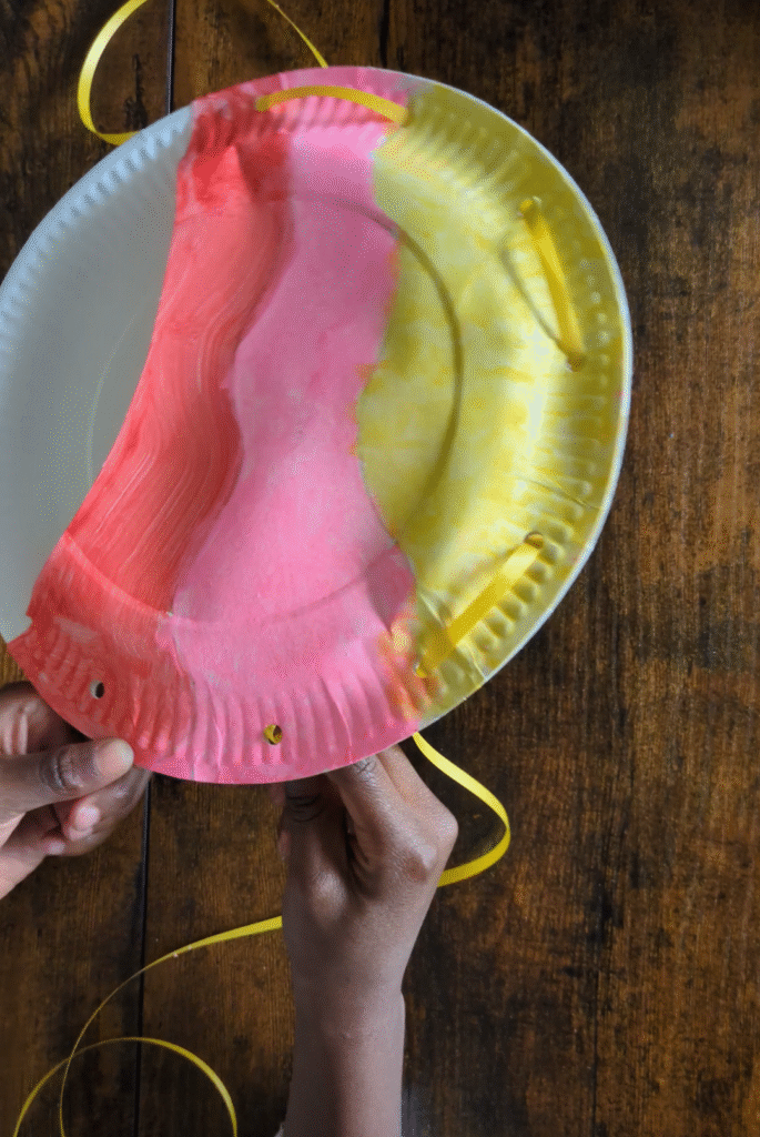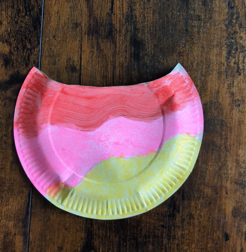 Paint the plates with your child’s favourite colour or theme (the full circle one and the half circle one) with washable paint, and set aside to dry. When dry, you can go ahead and decorate with stickers, markers, pompoms, whatever you like. This is the part kids love most, so you might want to get them involved if you’d like. My girls were too busy playing pretend mom and dad with their dolls and had absolutely no interest in taking part, but became obsessed with the result.