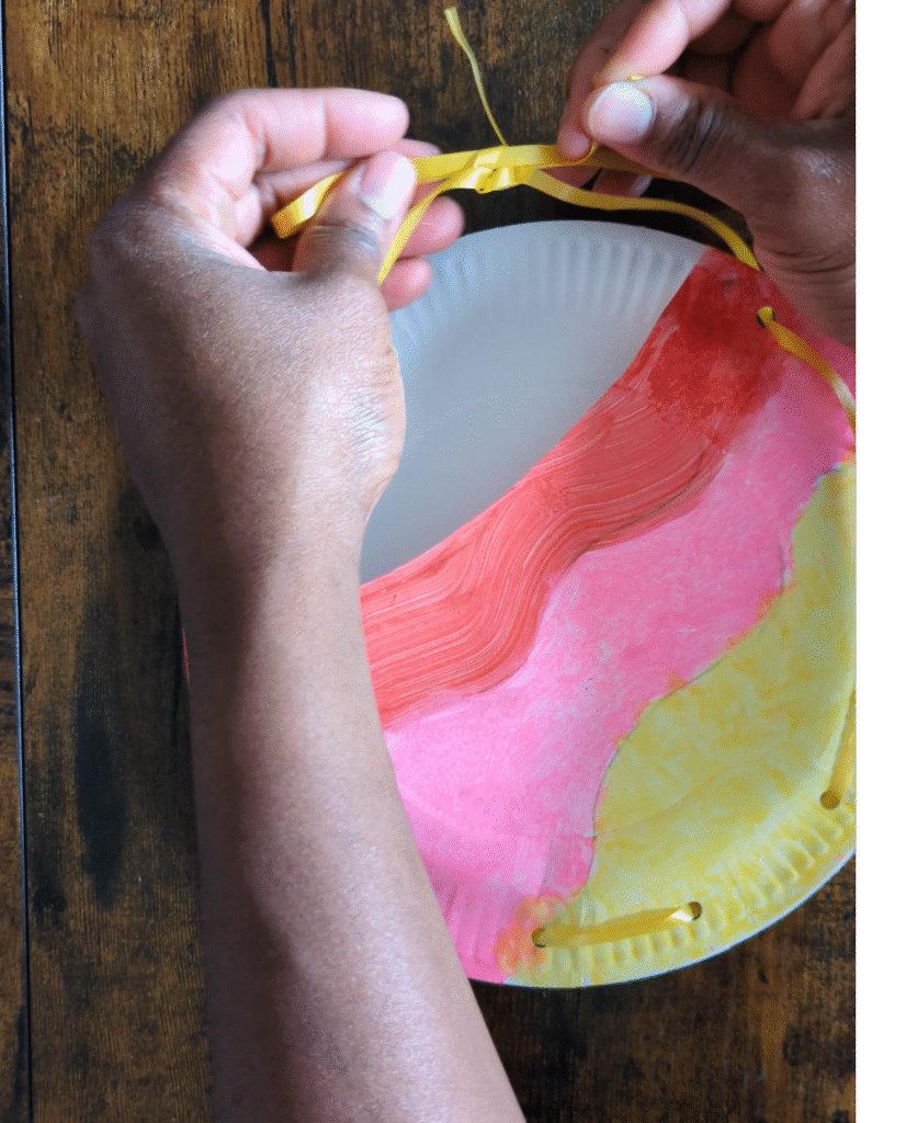 I love this next step because it’s such great fine motor practice. Get your ribbon and start threading it through the punched holes, moving from the back to the front and then onto the next one. Let your child take over here…because it’s fun, and a nice, busy time activity.