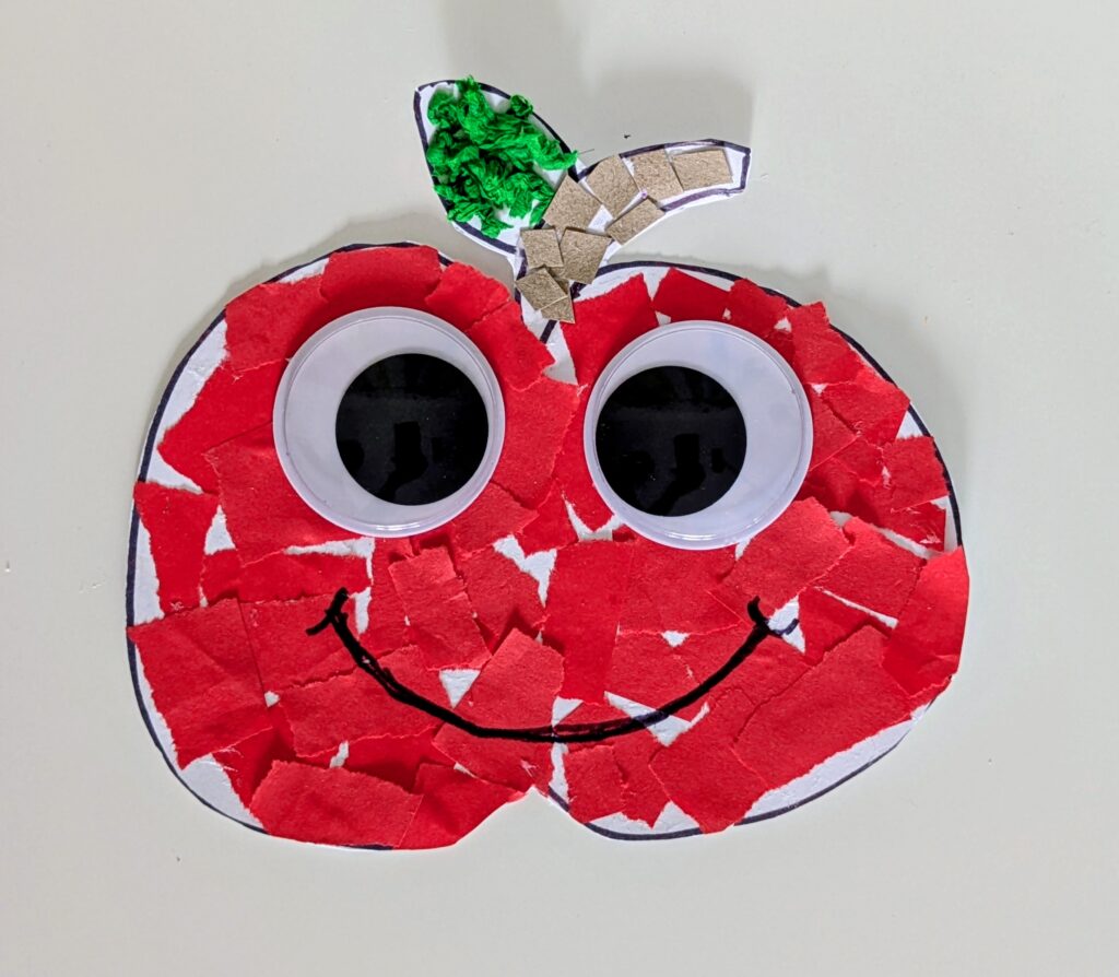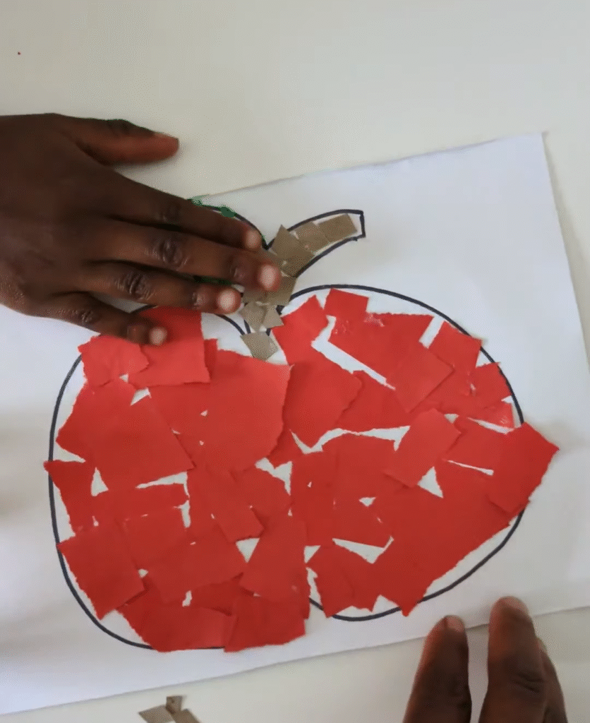 Our second project was a simple but sweet apple craft. It’s a collage, and I love making collages. Collages are perfect for toddlers and preschoolers because they practice tearing, pasting, and building fine motor skills.