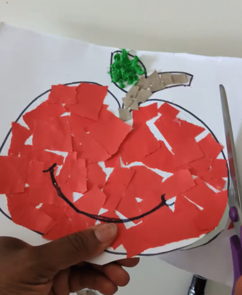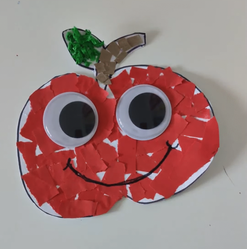 My kids loved tearing the red paper and seeing the apple shape fill in, plus it’s a great way to introduce them to autumn fruit while practising colours and shapes.