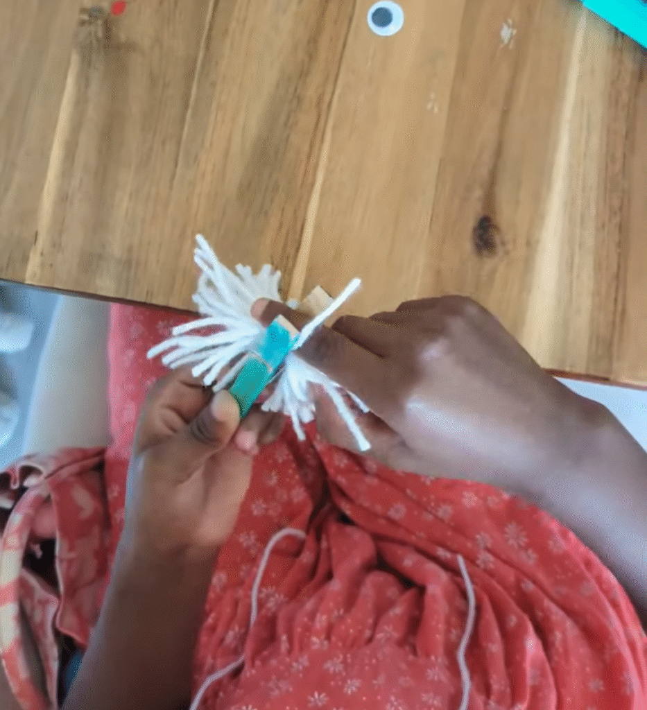 - Cut a small bunch of yarn strands, about 5–6 inches long, pinch the middle of the yarn and tie it so it looks like a bow.