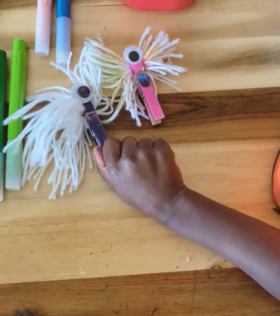 - Next, grab your clothespin and clip the middle of your yarn, then fluff it nicely with your fingers – this creates the monster’s hair. After that, stick a googly eye onto the front of the clothespin, and that’s it, you’ve created a monster in minutes.