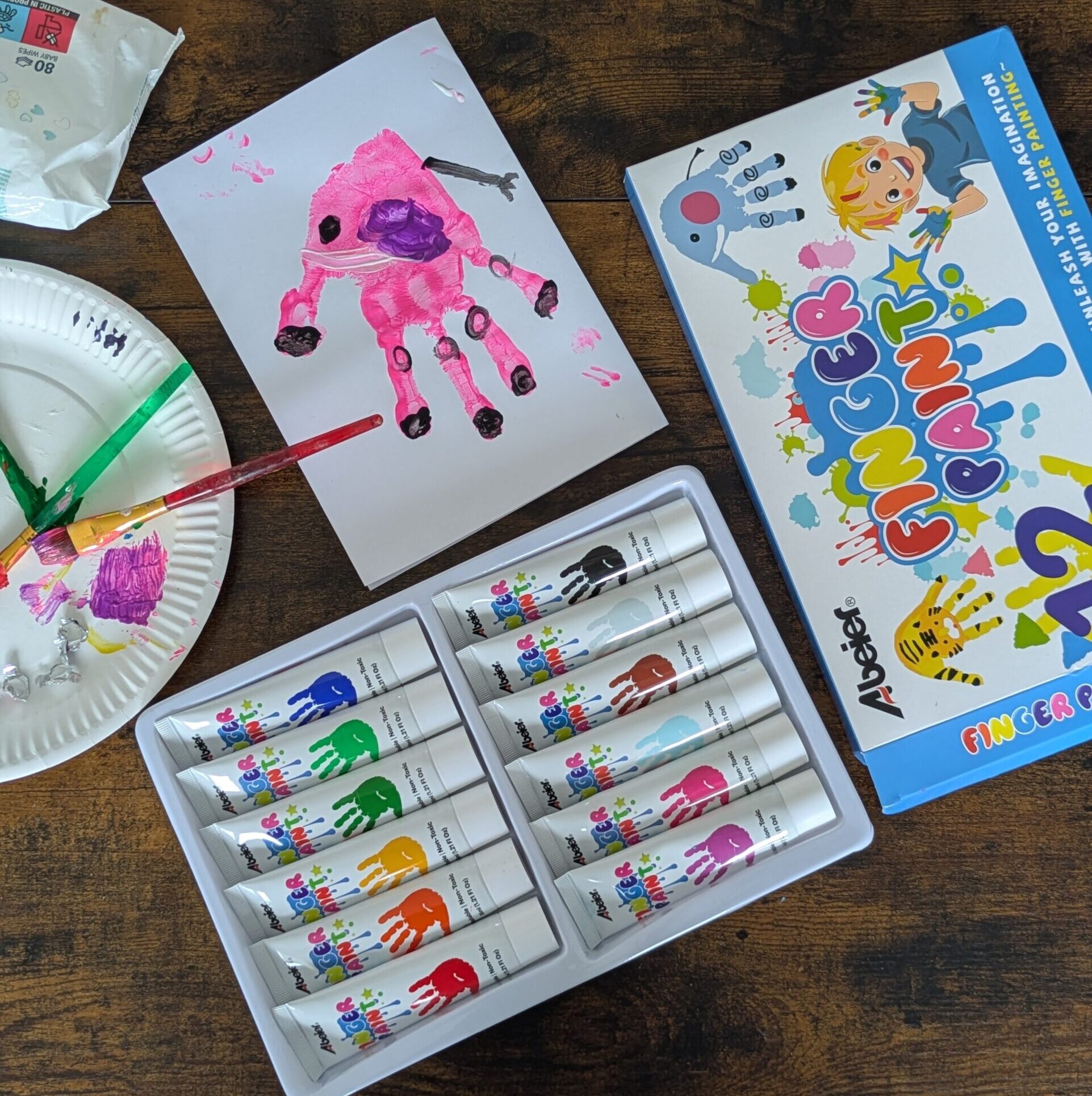 • Washability (from hands, clothes, and tables): For me, toddler paint should be able to wipe off skin and surfaces easily with baby wipes and rinse off easily with soap and water.
